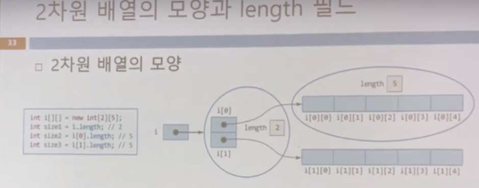 int[][] i = new int[2][5]; // intํ ๊ฐ์ ์ ์ฅํ๋ ํฌ๊ธฐ๊ฐ 2ํ 5์ด์ธ ๋ฐฐ์ด i ์ ์ธ ๋์์ ์์ฑ