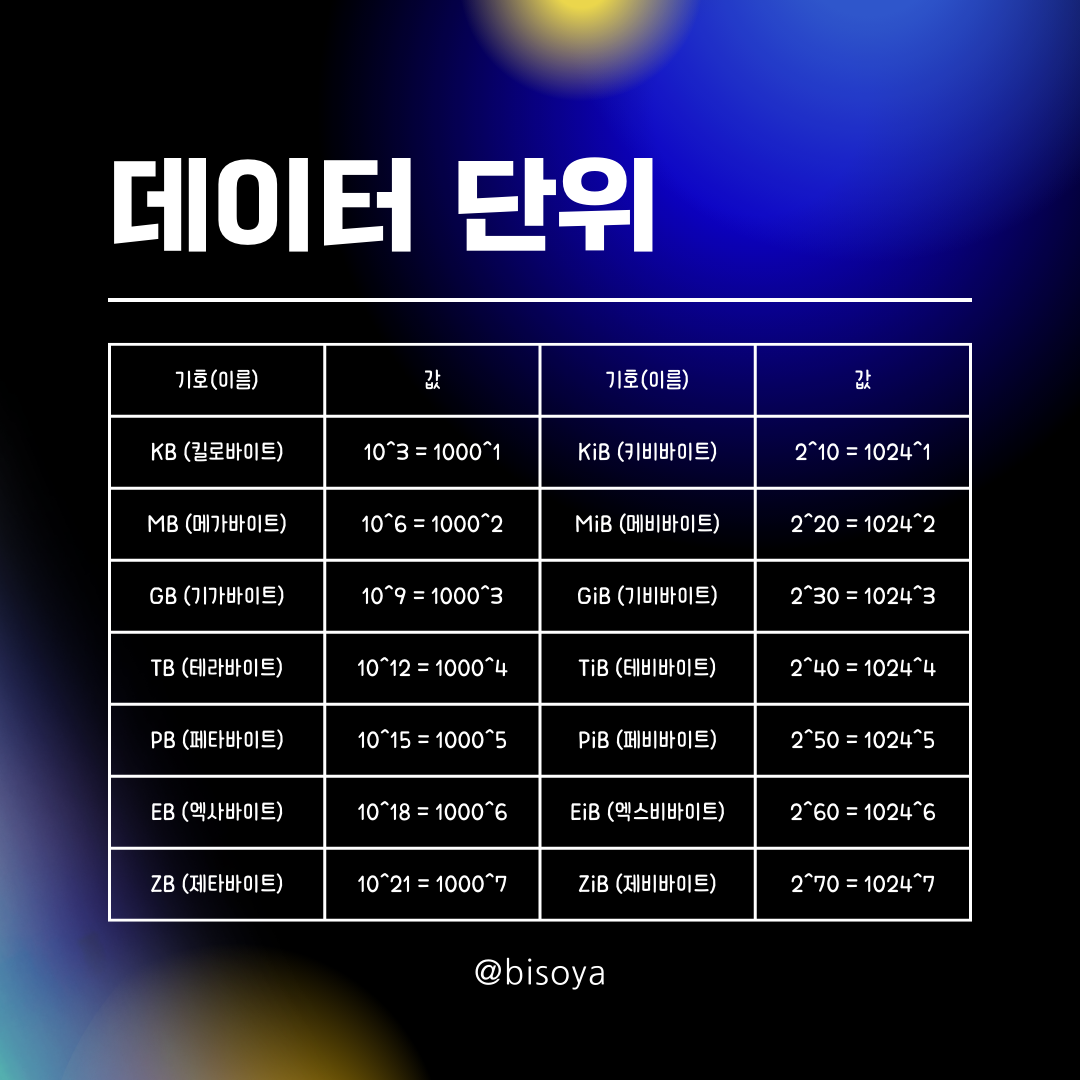 | KB (ํฌ๋ก๋ฐ์ดํธ) | 10^3 = 1000^1 | KiB (ํค๋น๋ฐ์ดํธ) | 2^10 = 1024^1 |