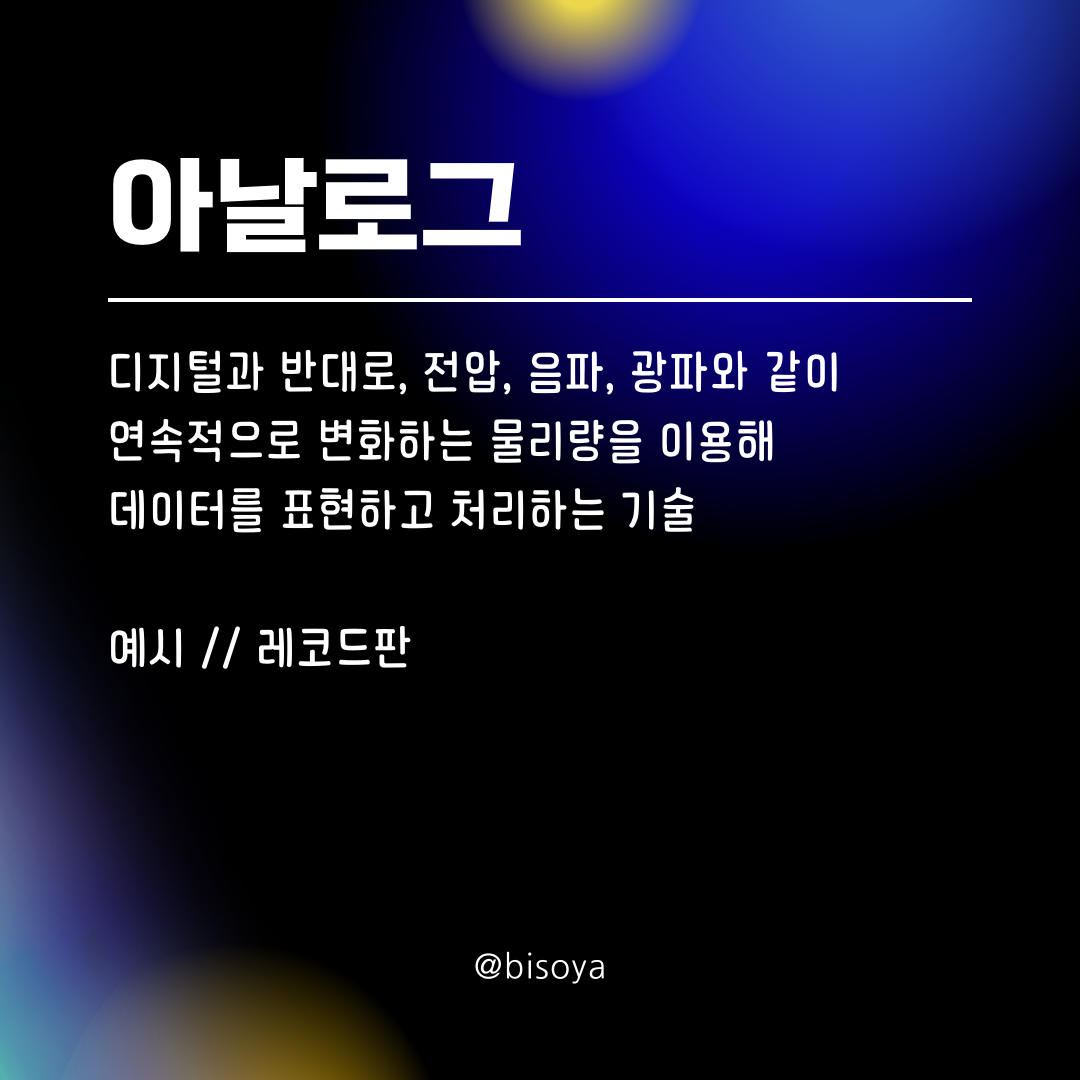 ๋ป // ๋์งํธ๊ณผ ๋ฐ๋๋ก, ์ ์, ์ํ, ๊ดํ์ ๊ฐ์ด ์ฐ์์ ์ผ๋ก ๋ณํํ๋ ๋ฌผ๋ฆฌ๋์ ์ด์ฉํด ๋ฐ์ดํฐ๋ฅผ ํํํ๊ณ ์ฒ๋ฆฌํ๋ ๊ธฐ์