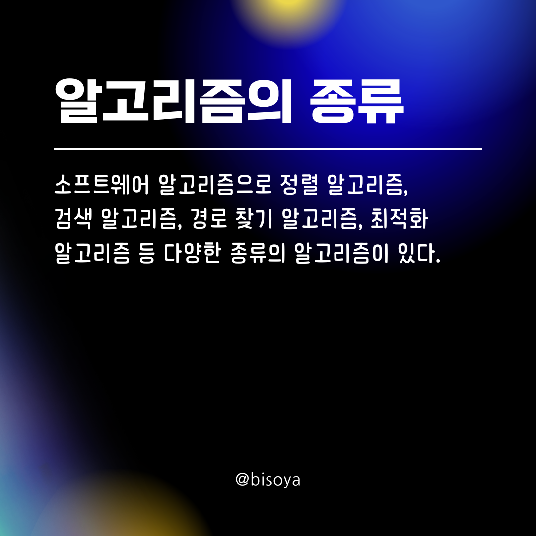 ์†Œํ”„ํŠธ์›จ์–ด ์•Œ๊ณ ๋ฆฌ์ฆ˜์œผ๋กœ ์ •๋ ฌ ์•Œ๊ณ ๋ฆฌ์ฆ˜, ๊ฒ€์ƒ‰ ์•Œ๊ณ ๋ฆฌ์ฆ˜, ๊ฒฝ๋กœ ์ฐพ๊ธฐ ์•Œ๊ณ ๋ฆฌ์ฆ˜, ์ตœ์ ํ™” ์•Œ๊ณ ๋ฆฌ์ฆ˜ ๋“ฑ ๋‹ค์–‘ํ•œ ์ข…๋ฅ˜์˜ ์•Œ๊ณ ๋ฆฌ์ฆ˜์ด ์žˆ๋‹ค.