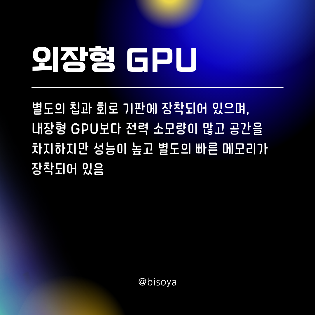 ๋ป // ๋ณ๋์ ์นฉ๊ณผ ํ๋ก ๊ธฐํ์ ์ฅ์ฐฉ๋์ด ์์ผ๋ฉฐ, ๋ด์ฅํ GPU๋ณด๋ค ์ ๋ ฅ ์๋ชจ๋์ด ๋ง๊ณ ๊ณต๊ฐ์ ์ฐจ์งํ์ง๋ง ์ฑ๋ฅ์ด ๋๊ณ ๋ณ๋์ ๋น ๋ฅธ ๋ฉ๋ชจ๋ฆฌ๊ฐ ์ฅ์ฐฉ๋์ด ์์