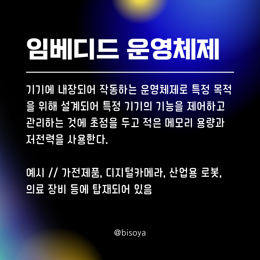 κΈ°κΈ°μ λ΄μ₯λμ΄ μλνλ μ΄μ체μ λ‘ νΉμ λͺ©μ μ μν΄ μ€κ³λμ΄ νΉμ κΈ°κΈ°μ κΈ°λ₯μ μ μ΄νκ³ κ΄νλ κ²μ μ΄μ μ λκ³ μ μ λ©λͺ¨λ¦¬ μ©λκ³Ό μ μ λ ₯μ μ¬μ©νλ€.