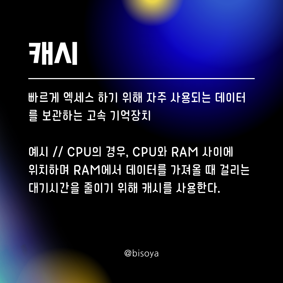 ์์ // CPU์ ๊ฒฝ์ฐ, CPU์ RAM ์ฌ์ด์ ์์นํ๋ฉฐ RAM์์ ๋ฐ์ดํฐ๋ฅผ ๊ฐ์ ธ์ฌ ๋ ๊ฑธ๋ฆฌ๋ ๋๊ธฐ์๊ฐ์ ์ค์ด๊ธฐ ์ํด ์บ์๋ฅผ ์ฌ์ฉํ๋ค.
