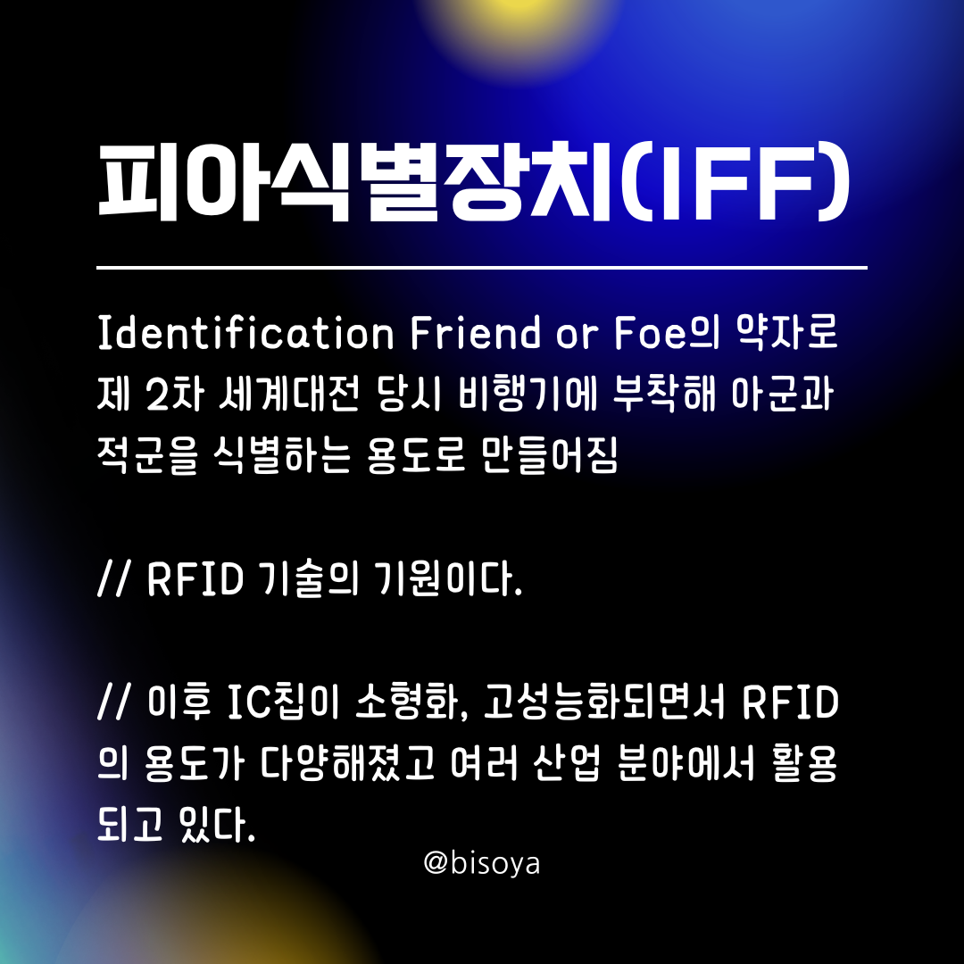 ๋ป // Identification Friend or Foe์ ์ฝ์๋ก ์ 2์ฐจ ์ธ๊ณ๋์ ๋น์ ๋นํ๊ธฐ์ ๋ถ์ฐฉํด ์๊ตฐ๊ณผ ์ ๊ตฐ์ ์๋ณํ๋ ์ฉ๋๋ก ๋ง๋ค์ด์ง