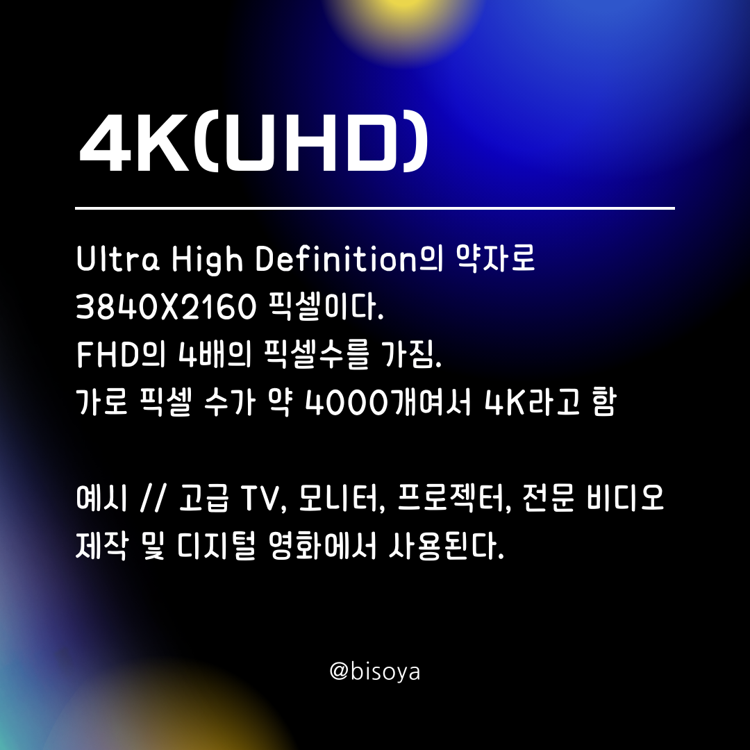 ๋ป // Ultra High Definition์ ์ฝ์๋ก 3840X2160 ํฝ์ ์ด๋ค. FHD์ 4๋ฐฐ์ ํฝ์ ์๋ฅผ ๊ฐ์ง. ๊ฐ๋ก ํฝ์ ์๊ฐ ์ฝ 4000๊ฐ์ฌ์ 4K๋ผ๊ณ ํจ