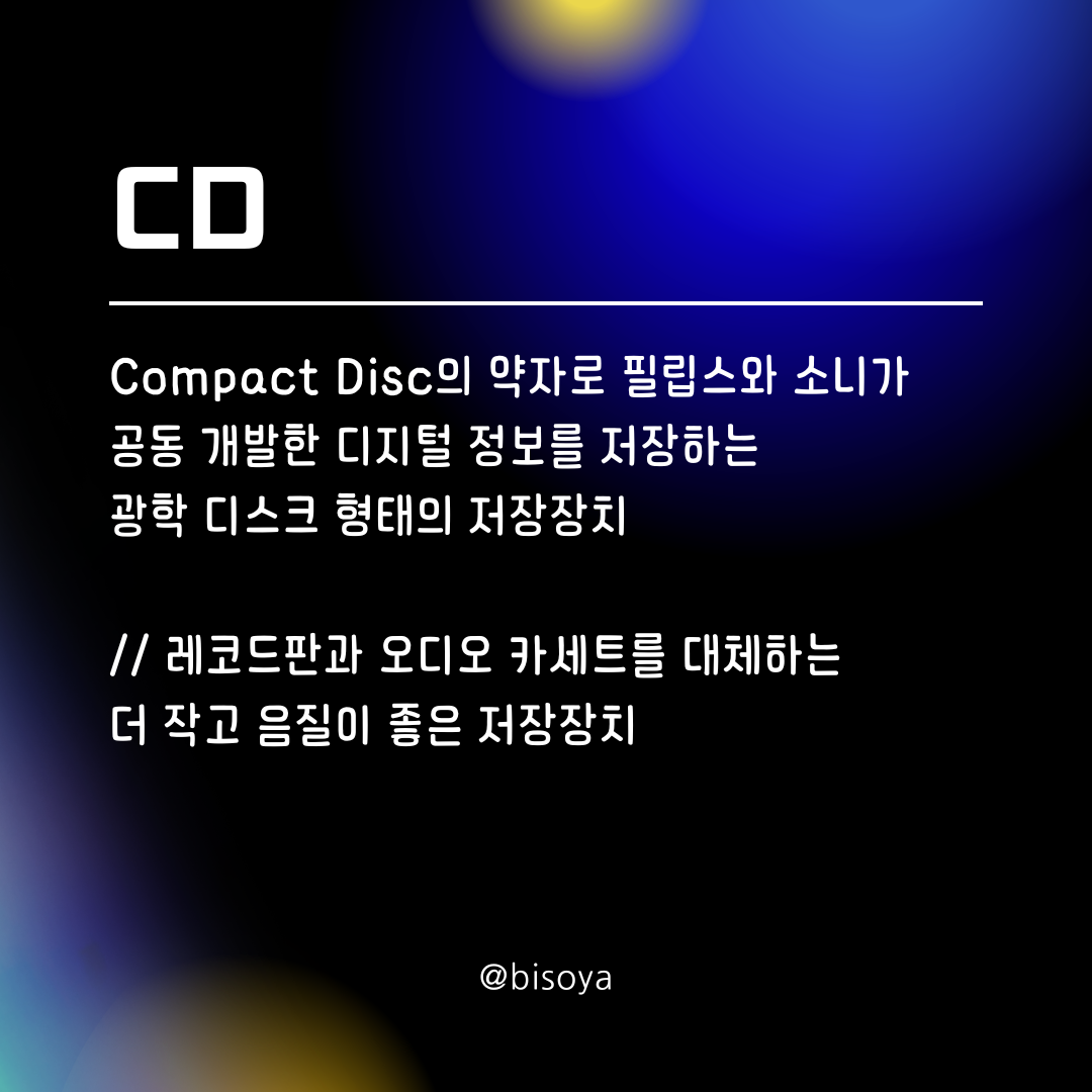 ๋ป // Compact Disc์ ์ฝ์๋ก ํ๋ฆฝ์ค์ ์๋๊ฐ ๊ณต๋ ๊ฐ๋ฐํ ๋์งํธ ์ ๋ณด๋ฅผ ์ ์ฅํ๋ ๊ดํ ๋์คํฌ ํํ์ ์ ์ฅ์ฅ์น
