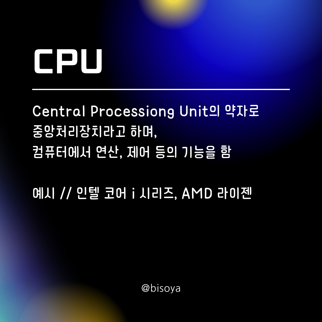 ๋ป // Central Processiong Unit์ ์ฝ์๋ก ์ค์์ฒ๋ฆฌ์ฅ์น๋ผ๊ณ ํ๋ฉฐ, ์ปดํจํฐ์์ ์ฐ์ฐ, ์ ์ด ๋ฑ์ ๊ธฐ๋ฅ์ ํจ