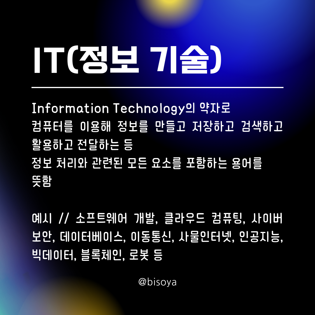 ๋ป // Information Technology์ ์ฝ์๋ก ์ปดํจํฐ๋ฅผ ์ด์ฉํด ์ ๋ณด๋ฅผ ๋ง๋ค๊ณ ์ ์ฅํ๊ณ ๊ฒ์ํ๊ณ ํ์ฉํ๊ณ ์ ๋ฌํ๋ ๋ฑ ์ ๋ณด ์ฒ๋ฆฌ์ ๊ด๋ จ๋ ๋ชจ๋ ์์๋ฅผ ํฌํจํ๋ ์ฉ์ด๋ฅผ ๋ปํจ