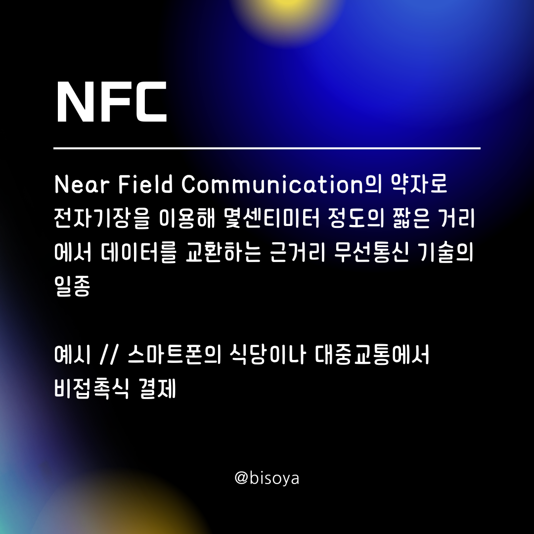 ๋ป // Near Field Communication์ ์ฝ์๋ก ์ ์๊ธฐ์ฅ์ ์ด์ฉํด ๋ช์ผํฐ๋ฏธํฐ ์ ๋์ ์งง์ ๊ฑฐ๋ฆฌ์์ ๋ฐ์ดํฐ๋ฅผ ๊ตํํ๋ ๊ทผ๊ฑฐ๋ฆฌ ๋ฌด์ ํต์ ๊ธฐ์ ์ ์ผ์ข