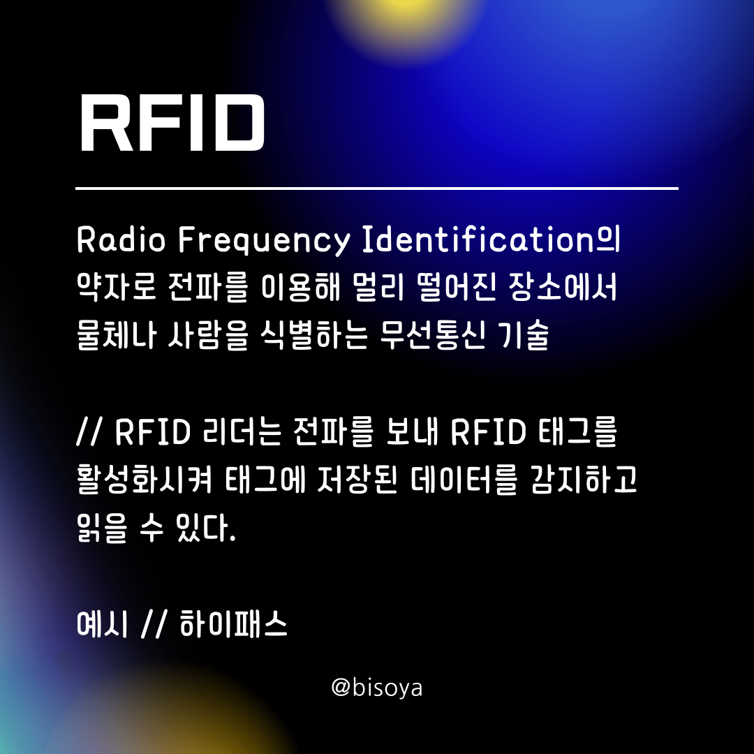 ๋œป // Radio Frequency Identification์˜ ์•ฝ์ž๋กœ ์ „ํŒŒ๋ฅผ ์ด์šฉํ•ด ๋ฉ€๋ฆฌ ๋–จ์–ด์ง„ ์žฅ์†Œ์—์„œ ๋ฌผ์ฒด๋‚˜ ์‚ฌ๋žŒ์„ ์‹๋ณ„ํ•˜๋Š” ๋ฌด์„ ํ†ต์‹  ๊ธฐ์ˆ