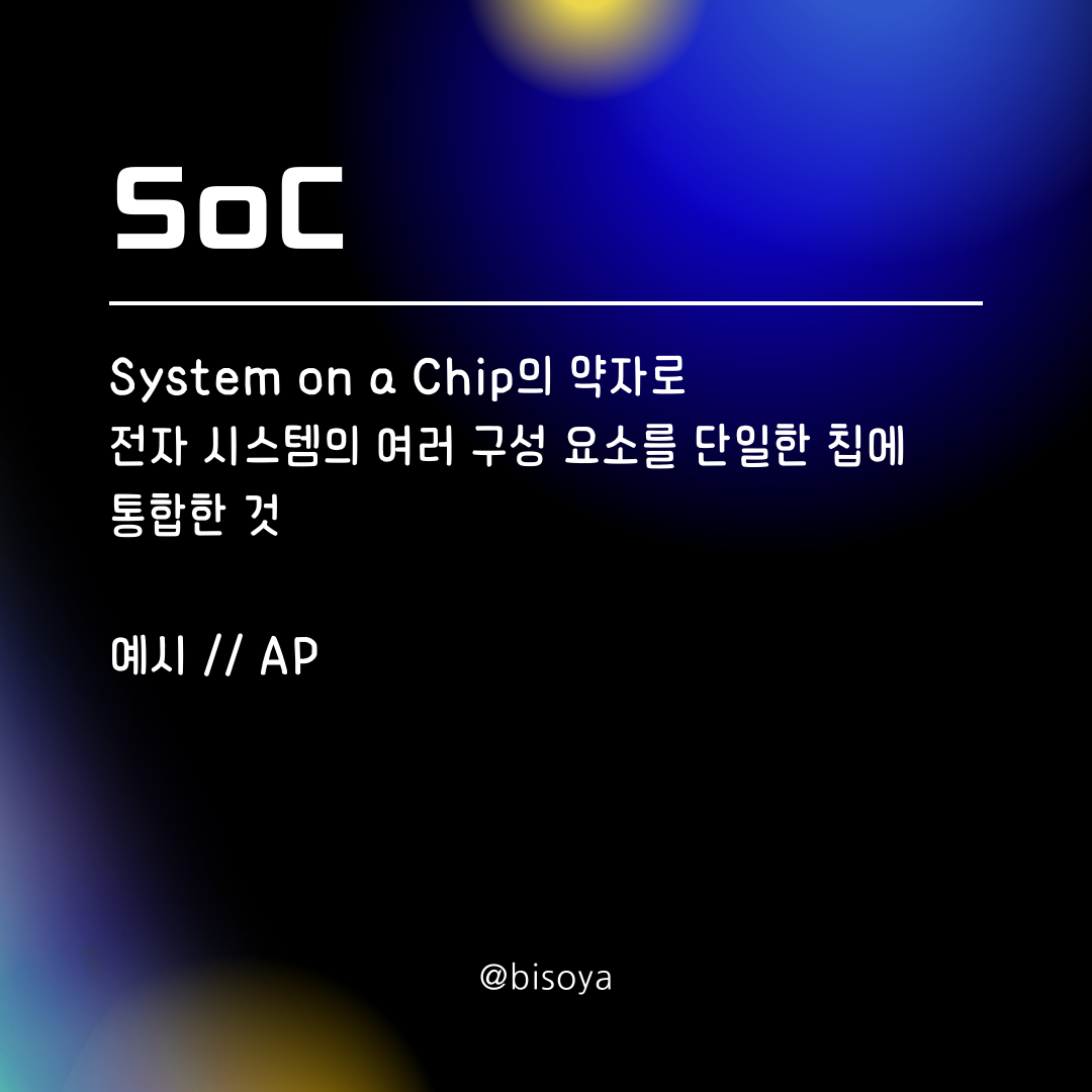 ๋ป // System on a Chip์ ์ฝ์๋ก ์ ์ ์์คํ ์ ์ฌ๋ฌ ๊ตฌ์ฑ ์์๋ฅผ ๋จ์ผํ ์นฉ์ ํตํฉํ ๊ฒ