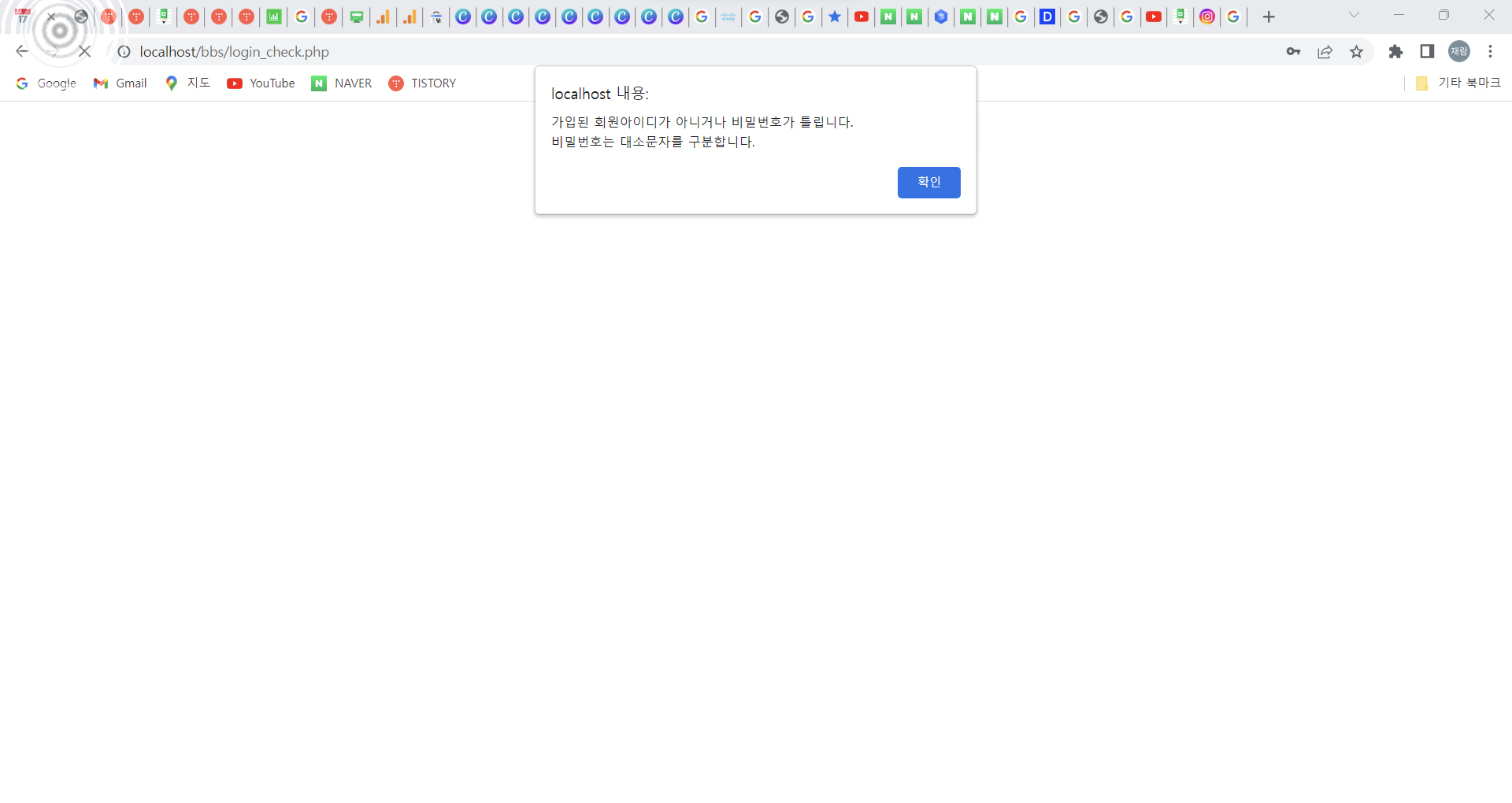 Step 1) ๋ก๊ทธ์ธ ํ์ด์ง์์ ๊ณ์ ์ ๋ณด ์ ๋ ฅ ์ ๋๋์ ๋ฌธ์์ด์ ์ ๋ ฅํ์ฌ ์๋ฌ ํ์ด์ง๋ ์ค๋ฅ๊ฐ ๋ฐ์ํ๋์ง ์ ๊ฒ // ์ํธ