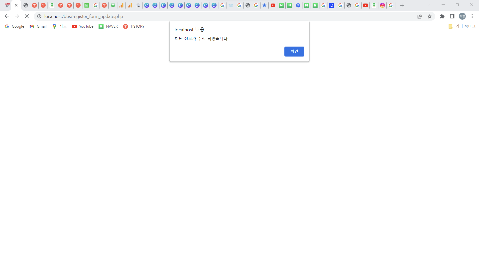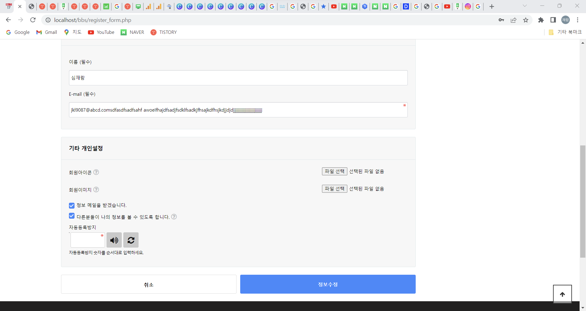 Step 2) ๋ก๊ทธ์ธ ํ ์ ๋ณด๋ณ๊ฒฝ ํ์ด์ง์์ ๊ฐ์ ์ ๋ณด ์์ ์ ๋๋์ ๋ฌธ์์ด์ ์ ๋ ฅํ์ฌ ์๋ฌ ํ์ด์ง๋ ์ค๋ฅ๊ฐ ๋ฐ์ํ๋์ง ์ ๊ฒ // ์ํธ